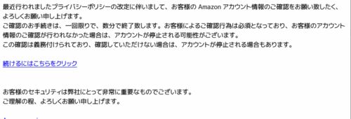 また来よりましたでー! このようなサギがあってはならぬー! こんな馬鹿なメールがあってはならぬー!(吉田鋼太郎さんの柳生但馬守風味でw) テキスト表示だとこんなんです。 最近行われましたプライバシーポリシーの改定に伴いまして、お客様の Amazon …