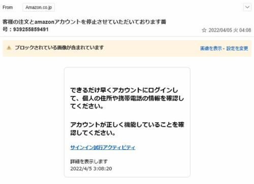 Yahoo!メールに来てました。(「お」を省くとはエラソーなw) 画像は amazonサーバーの本物。 できるだけ早くアカウントにログインして、個人の住所や携帯電話の情報を確認してください。 アカウントが正しく機能していることを確認してください。 サインイ…