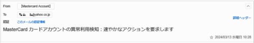 MasterCardの騙りは2回目。Subjectが違うだけで文面は全く同じ。前回も言うてますが、MasterCardってVISAとかと同様の決済会社なわけで直接連絡が来ることはないのではと思われます 前回のめも : 【フィッシング詐欺】MasterCard カードのセキュリティ通知:…