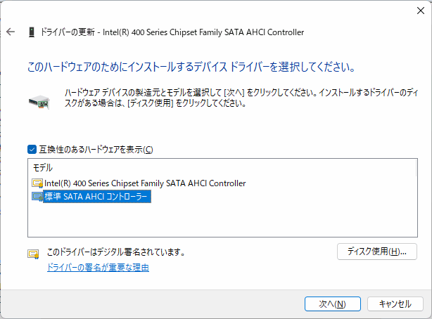 - 「標準 SATA AHCI コントローラー」を選択して 次へ